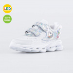 Стильные кроссовки с LED-подсветкой, созданные с учетом особенностей детской стопы, подходят для девочки. Верх из материала Softshell защищает ножки от непредсказуемых погодных условий. А текстильная подкладка, на 80% состоящая из хлопка, и кожаная стелька обеспечивают комфортный микроклимат внутри. Защитная накладка на носу продлевает срок службы обуви. Обувь на ноге фиксируют две липучки-велькро. Подошва из суперлегкого материала ЭВА оснащена мигающими светодиодами. Дополнительную изюминку придают сердечки, наполненные глиттером. Модель для детского возраста, поэтому большое внимание уделено анатомии: пяточка приподнята, круглый носок не стесняет движений пальчиков, а задник надежно фиксирует пятку во время движений.